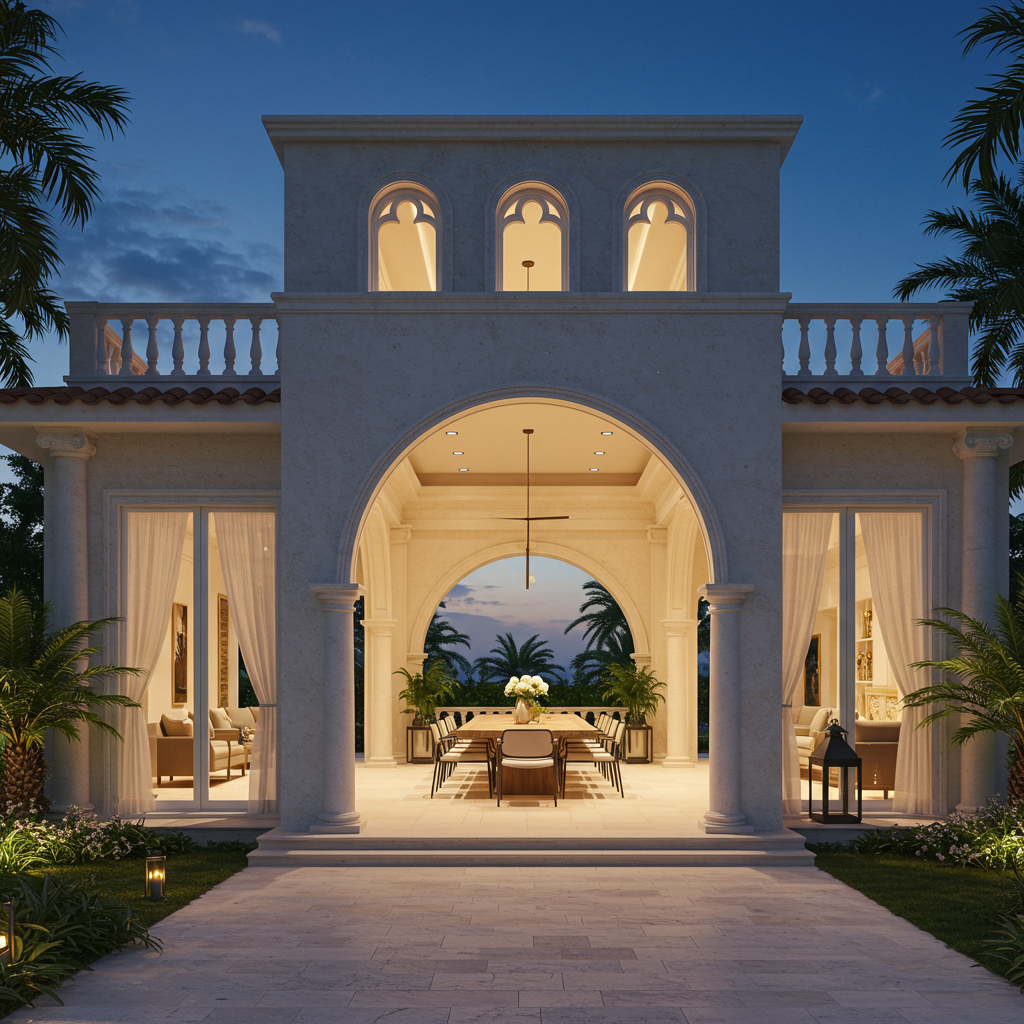 Features include a loggia with a summer kitchen, an open floor plan, hardwood floors and 12ft high ceilings, elegant coral stone architectural details, custom wood cabinets, a private elevator, and a 4-car garage.
