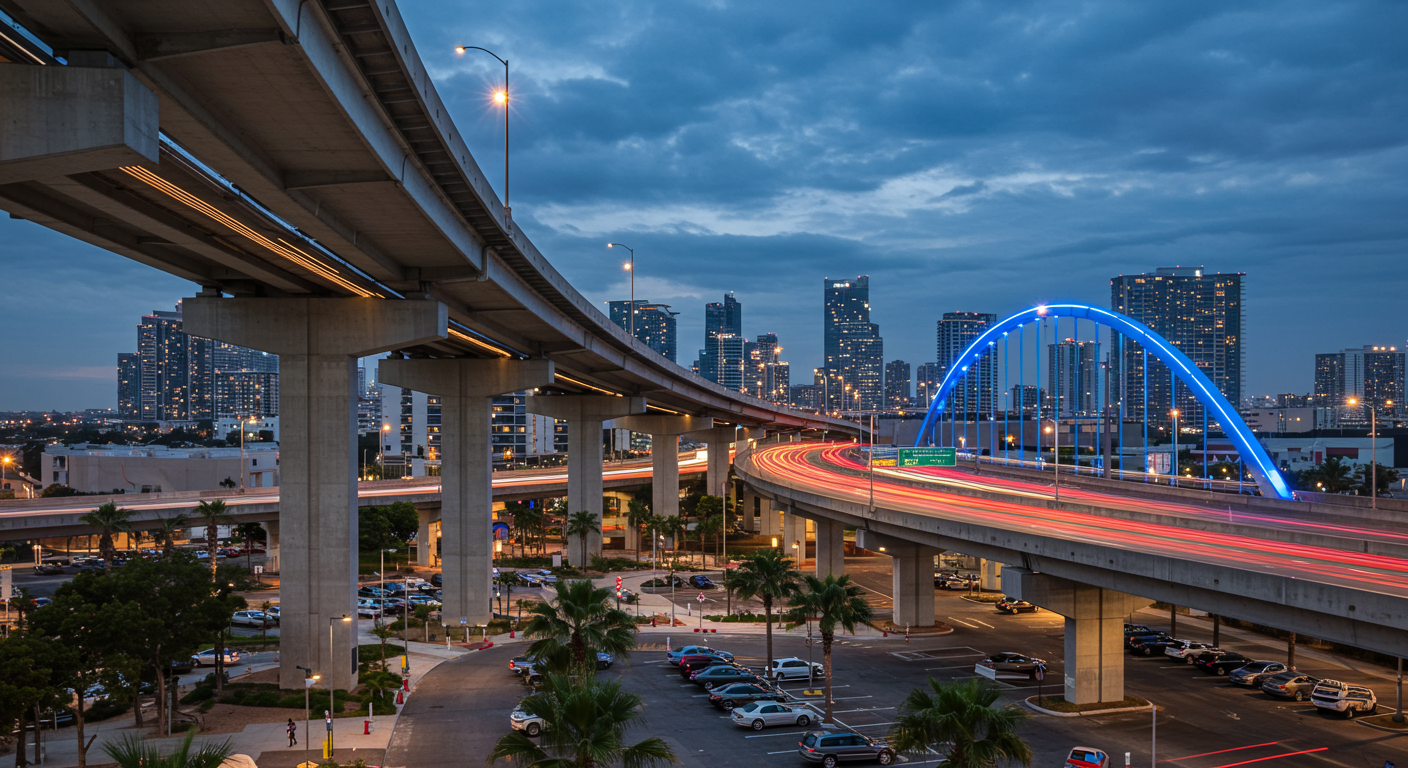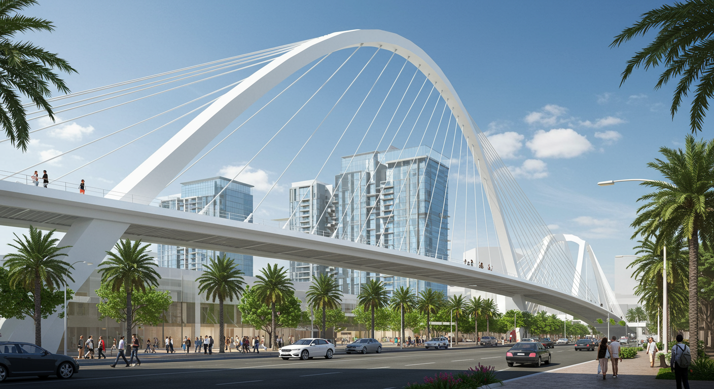 The bridge's strategic placement of the arches at the center of the roadway makes it a visual destination from different angles, offering stunning views to cruise ship passengers, airplane passengers, pedestrians, and motorists alike. Additionally, the bridge is accompanied by a 55-acre urban park under and around the new I-395, featuring the Heritage Walk memorializing Miami's rich history.