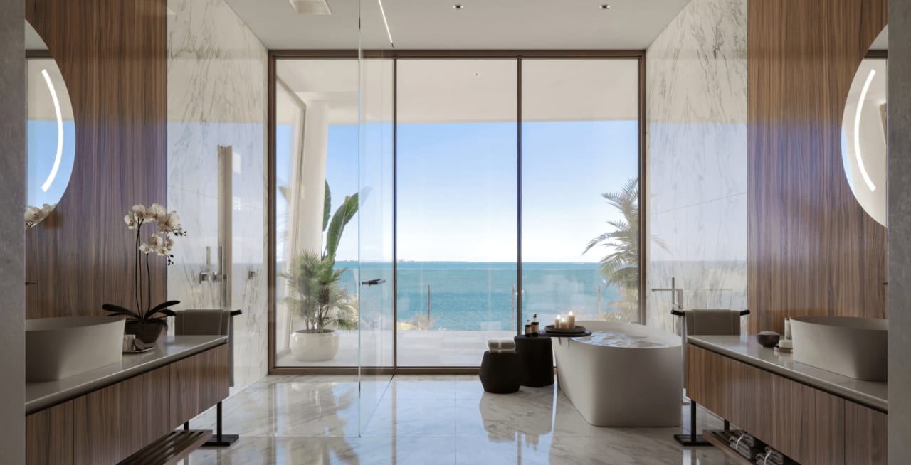 - High-tech window wall overlooking Biscayne Bay provides privacy on demand, transitioning from transparent to frosted at the touch of a button
